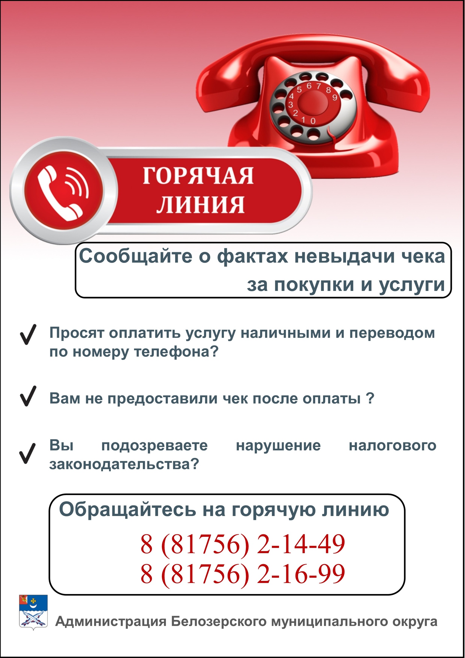 О фактах не оформления трудовых отношений и выплаты заработной платы «в конвертах» можно сообщить по номеру телефона «горячей линии»: 8 (81756) 2-11-97